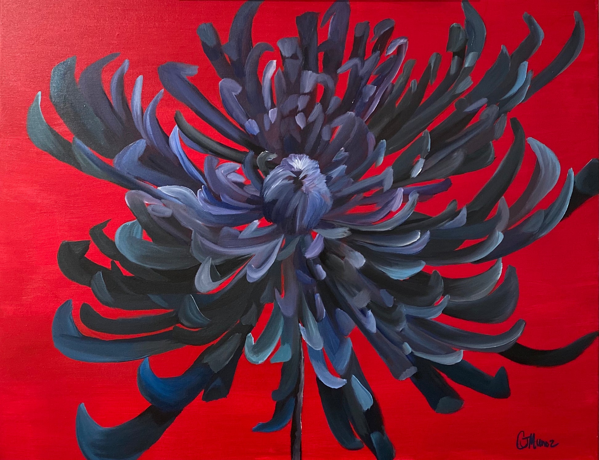 This striking 30x40” mixed media painting on canvas features a single dramatic chrysanthemum in deep purples, blues, and blacks set against a vibrant red background. The bold contrast and dynamic brushwork capture the energy and essence of the flower, blending elegance with intensity.